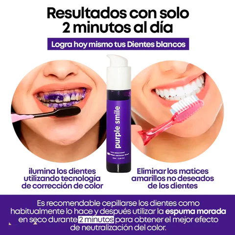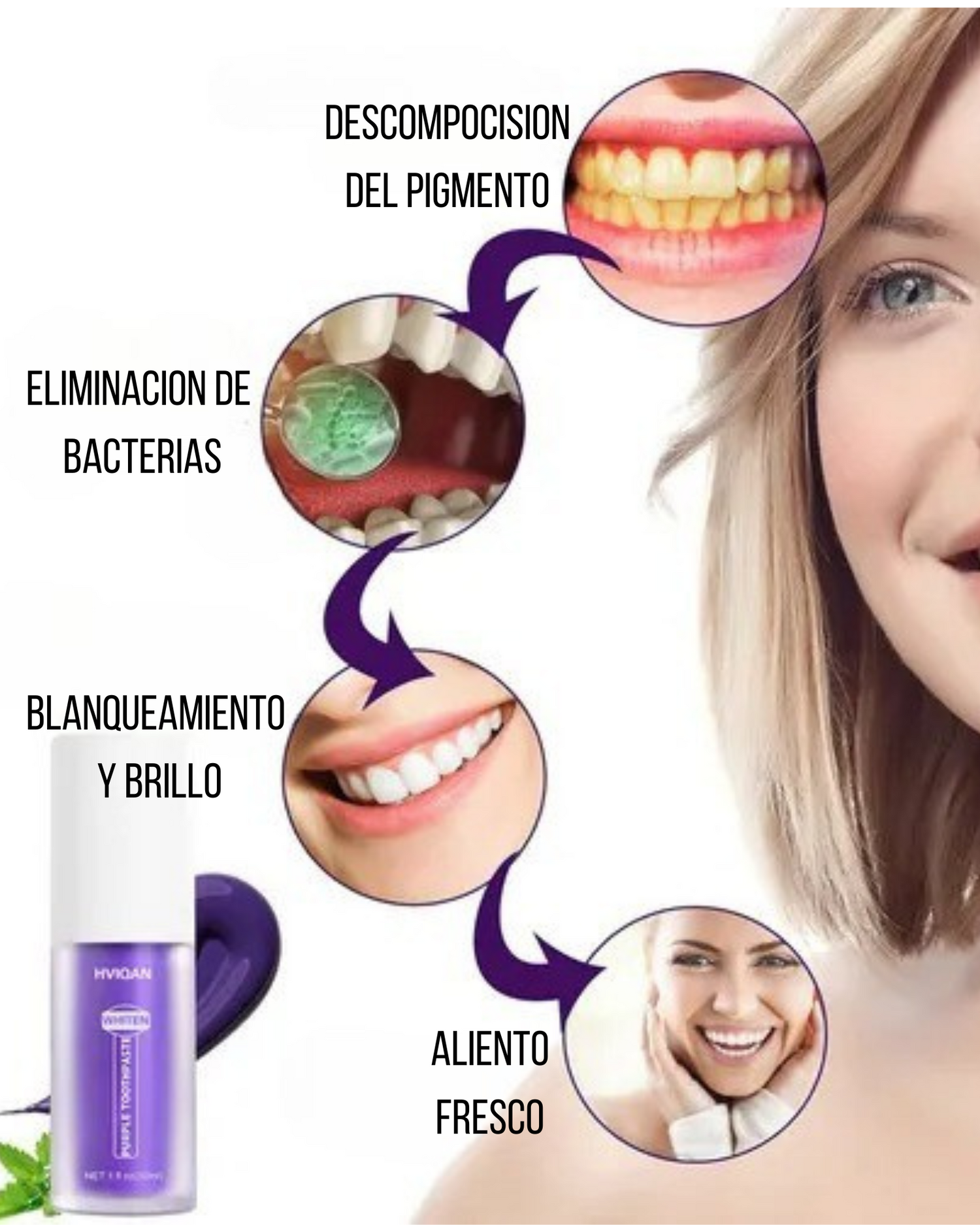 “V34 Purple Smile™ utiliza tecnología avanzada de corrección de color para neutralizar tonos amarillos y devolver el blanco natural a tu sonrisa, sin tratamientos invasivos.”👌